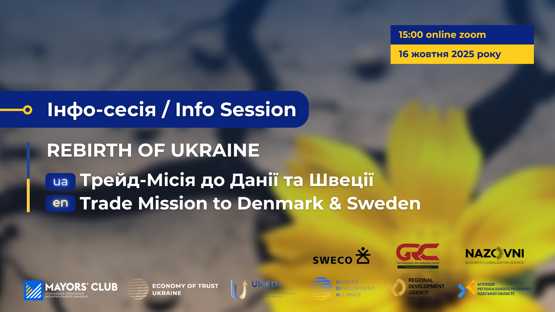📆 On October 16, 2025, at 15:00 Kyiv time, the Третя Інфо-сесія щодо майбутньої Трейд-Місії REBIRTH OF UKRAINE до Данії та Швеції , яка запланована 26-29 жовтня в Копенгагені та 29-31 жовтня в Стокгольмі. Проведення цього заходу стане першим кроком на шляху до головної мети поїздки - об’єднання представників данського, шведського та українського бізнесів, лідерів та представників муніципалітетів, інвесторів, донорів, робітників фінансових установ та урядових організацій для забезпечення ефективного відновлення та сталого розвитку України.