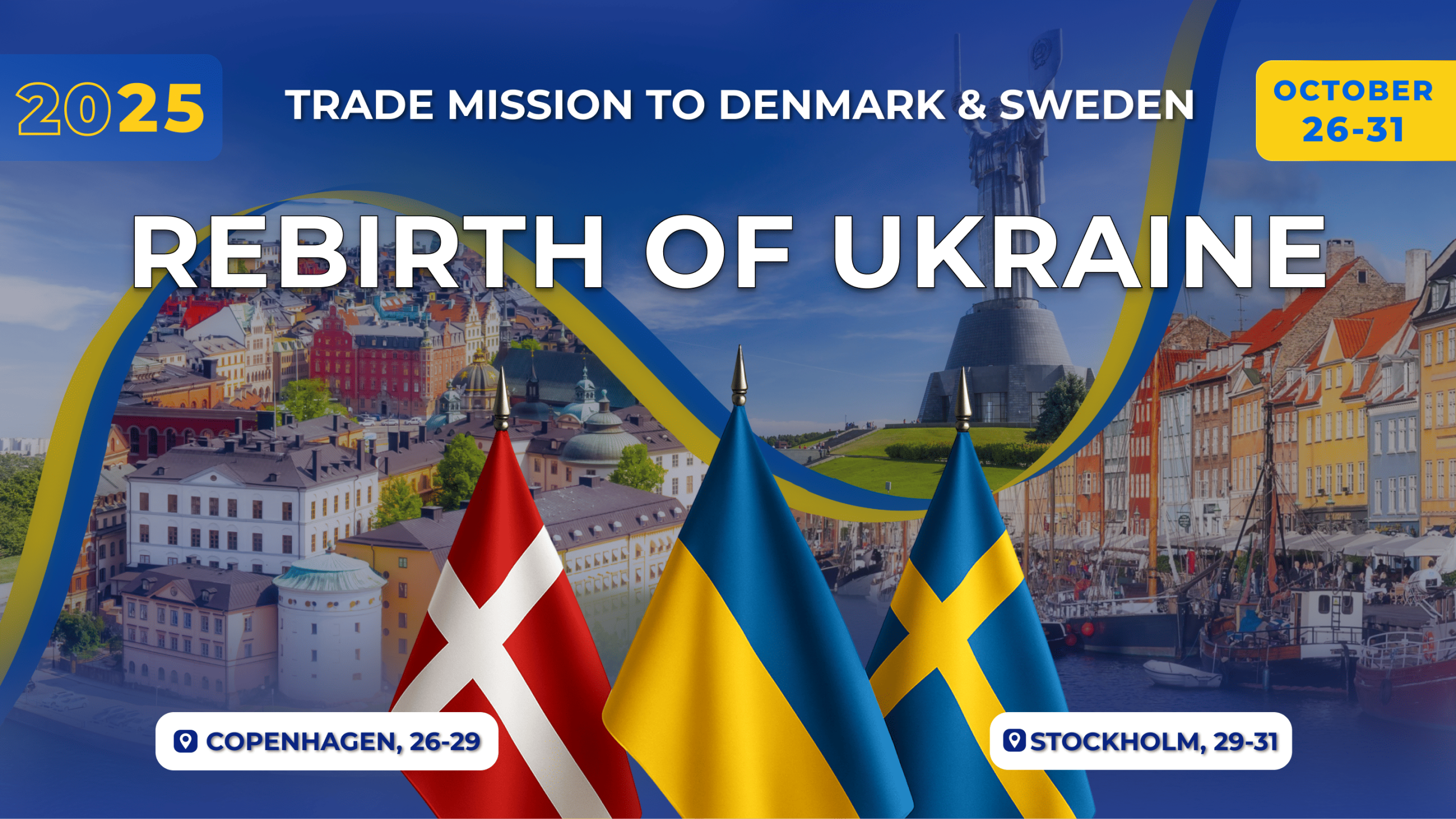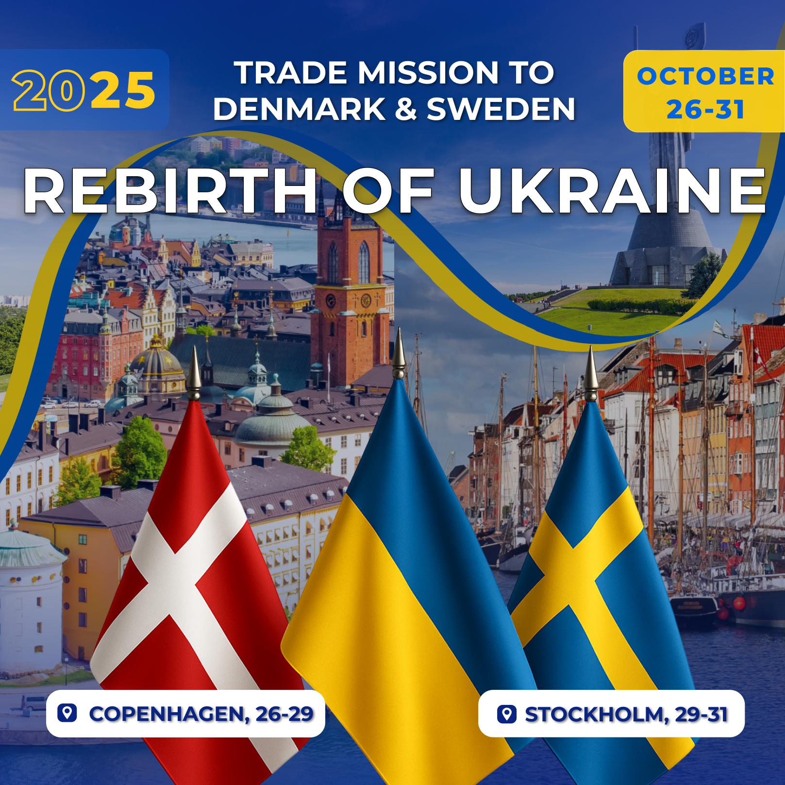 Трейд-місія “REBIRTH OF UKRAINE” Трейд-Місія покликана об’єднати представників данського, шведського та українського бізнесів, лідерів та представників муніципалітетів, венчурних інвесторів, імпакт-інвесторів, донорів, фінансові установи, ангельських та корпоративних інвесторів, наукові кола та урядові організації для сприяння успішній відбудові та економічному відновленню України за допомогою налагодження конструктивного діалогу, який неодмінно призведе до формуванню довгострокових взаємовигідних відносин з міжнародними партнерами.
